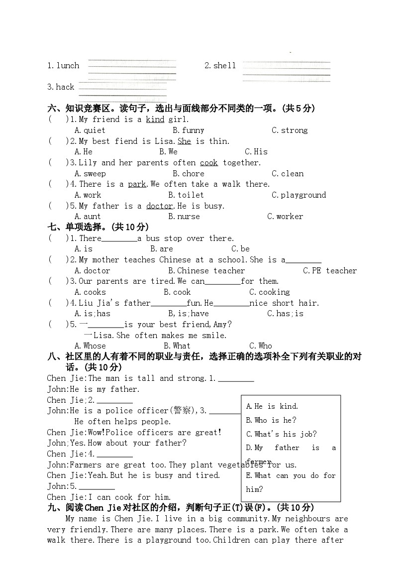 人教版2025-2026学年小学四年级英语上册期中综合测试卷